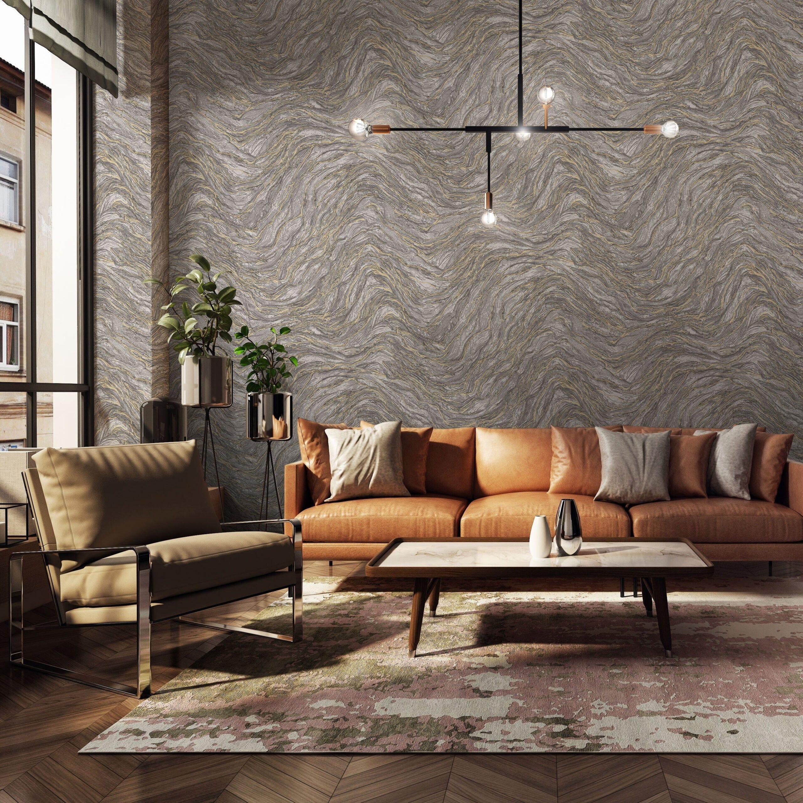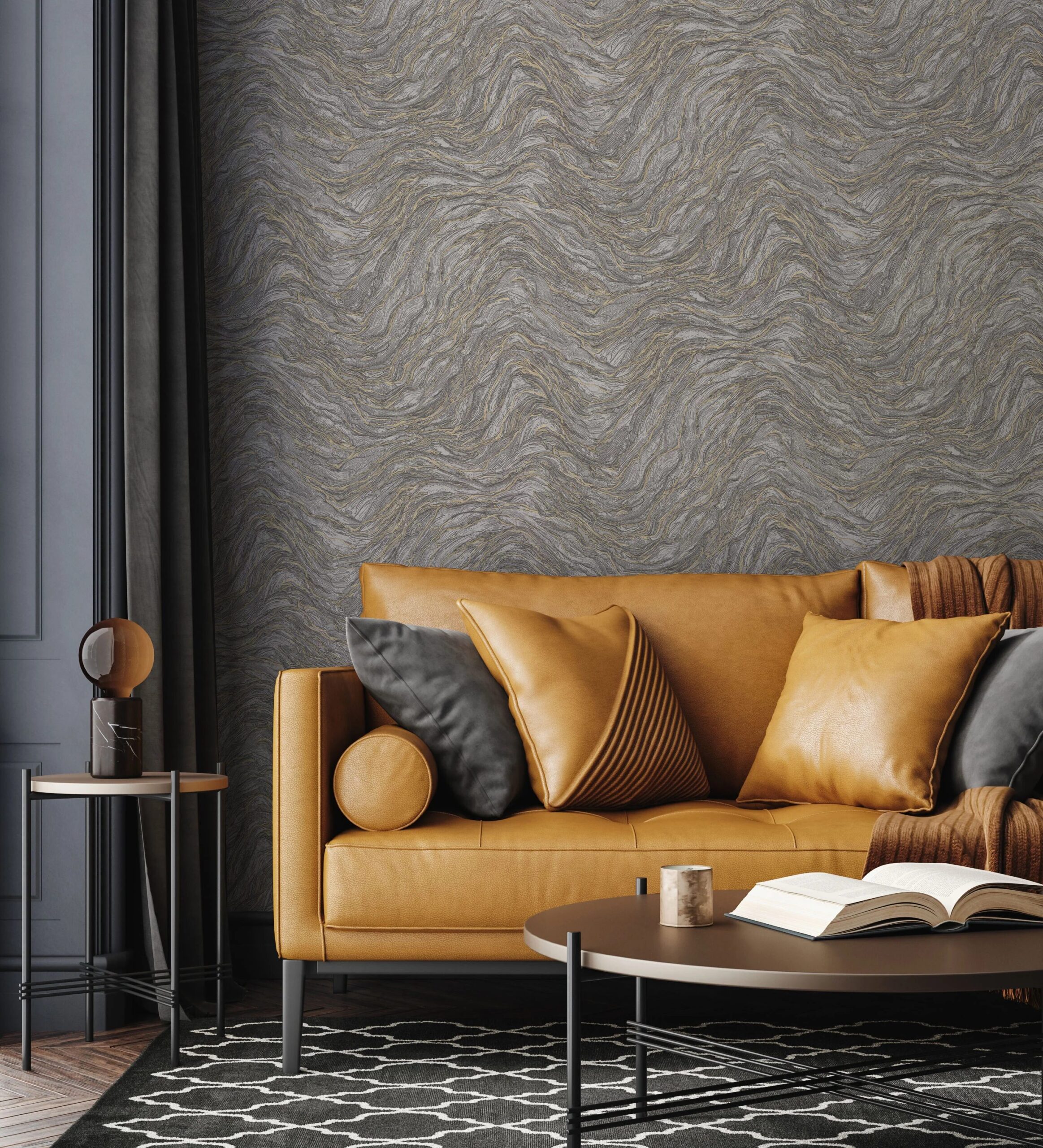 Culoarea gri, combinată cu accente aurii, conferă un contrast elegant și echilibrat, ideal pentru livinguri, dormitoare, holuri sau pentru realizarea unui perete de accent cu impact vizual modern și premium.